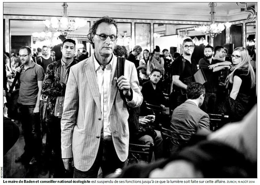 Droit derrière lui, l’homme aux bras croisés. Teint mat, cheveux noirs, et ce regard qui l’est tout autant. Les bras croisés sur le torse composent la posture défensive par excellence, peut-être l’homme veut-il se protéger de Geri Müller, le maire de Baden est-il une maladie transmissible?