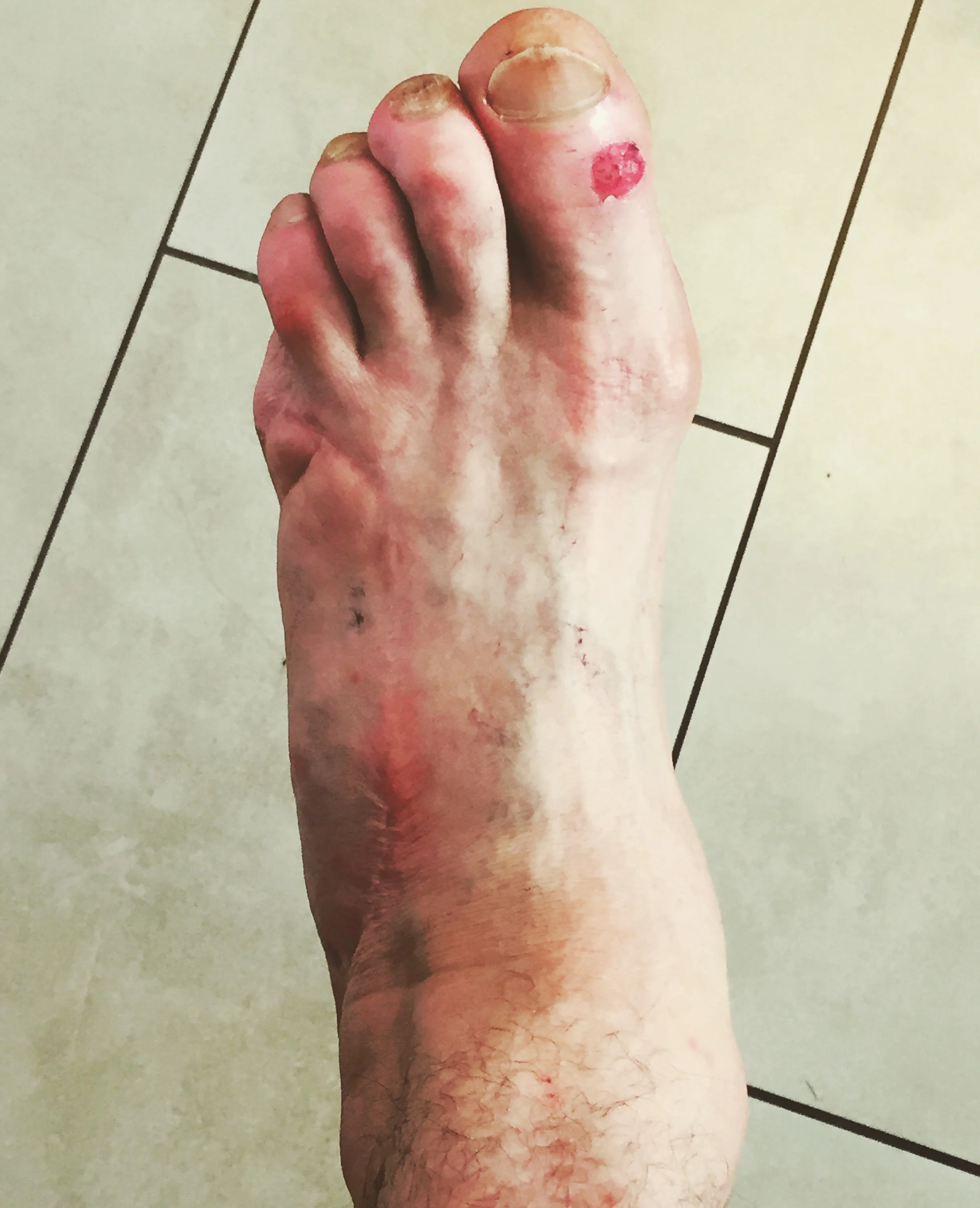 Au volant de son bolide, l’œil embrumé, au bord de l’endormissement, il quittait sa piste de gauche pour rouler à droite, il s'emmêlait les pieds, les pinceaux et les pédales de vitesse, perdait le contrôle de son véhicule en même temps que moi un doigt de pied: le petit orteil loin, le quintus raus. Perforé par la pédale de mon vélomoteur.